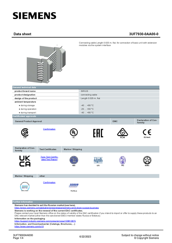 3UF79300AA000 Siemens 3UF79300AA000 3UF7930-0AA00-0 Kabel łączący 1 szt.