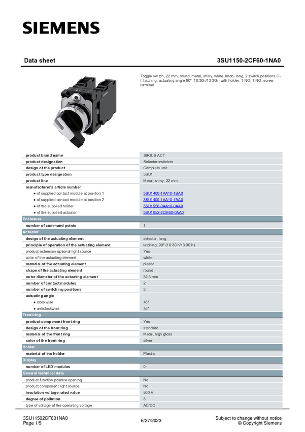 3SU11502CF601NA0 Siemens 3SU11502CF601NA0 3SU1150-2CF60-1NA0 Przełącznik 1 szt.