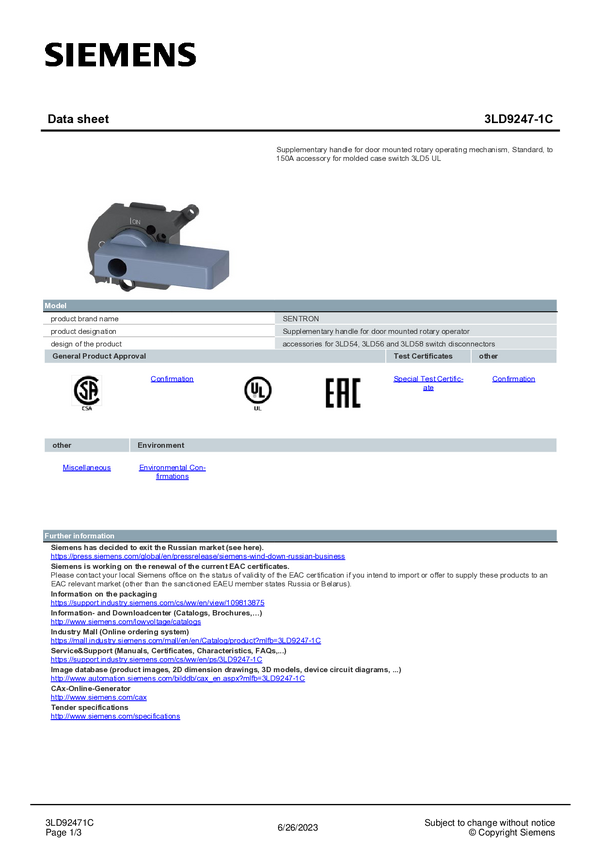 3LD92471C Siemens 3LD92471C Napęd obrotowy sprzęgła drzwi 3LD9247-1C