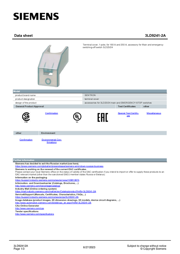 3LD92412A Siemens 3LD92412A Pokrywa zacisków 3LD9241-2A