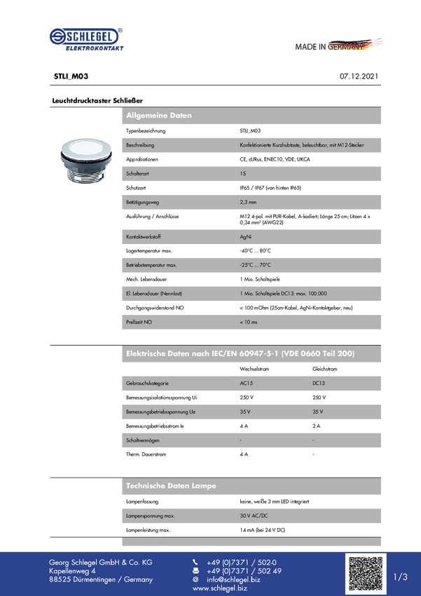 STLI_M03 Schlegel STLI_M03 Przycisk chwilowy IP65, IP67 1 szt.