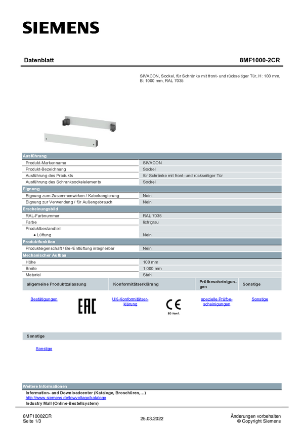 Gniazdo Siemens 8MF1000-2CR (S x W) 1000 mm x 100 mm stal 1 zest.