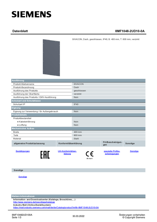 8MF10482UD100A Dach Siemens 8MF1048-2UD10-0A (D x S) 800 mm x 400 mm stal 1 szt.