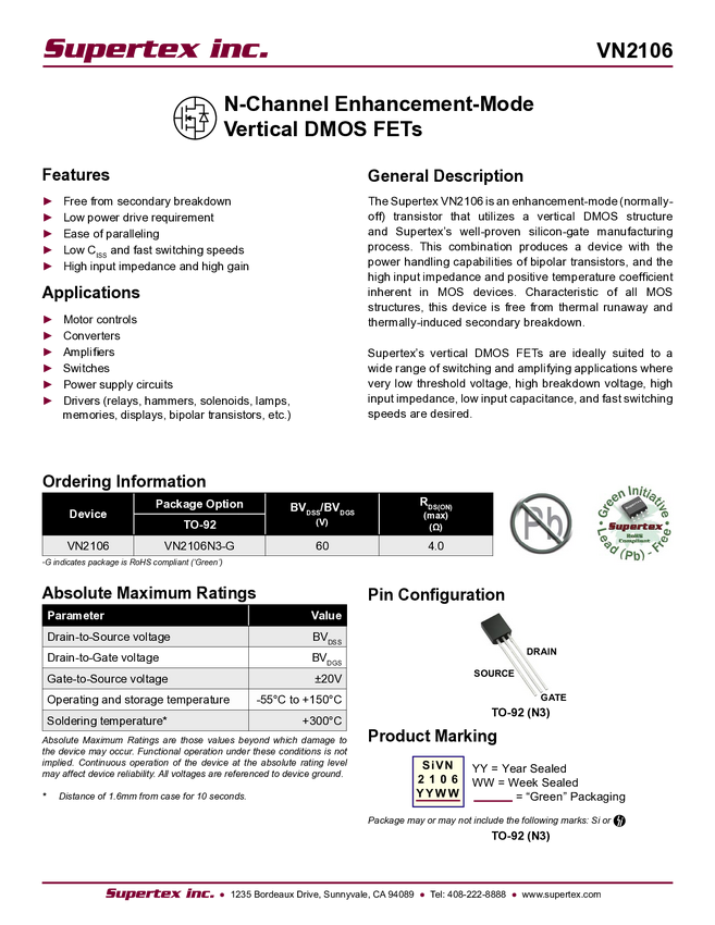 VN2106 N-Channel Enhancement-Mode Vertical DMOS FET Data Sheet
