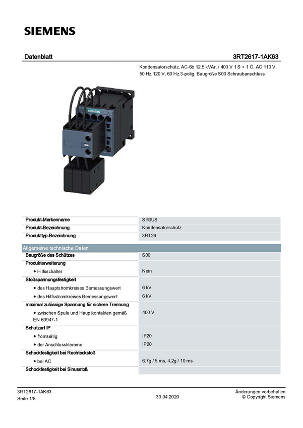 Stycznik kondensatorowy Siemens 3RT2617-1AK63 3RT26171AK63, 3 styki, 1 szt.