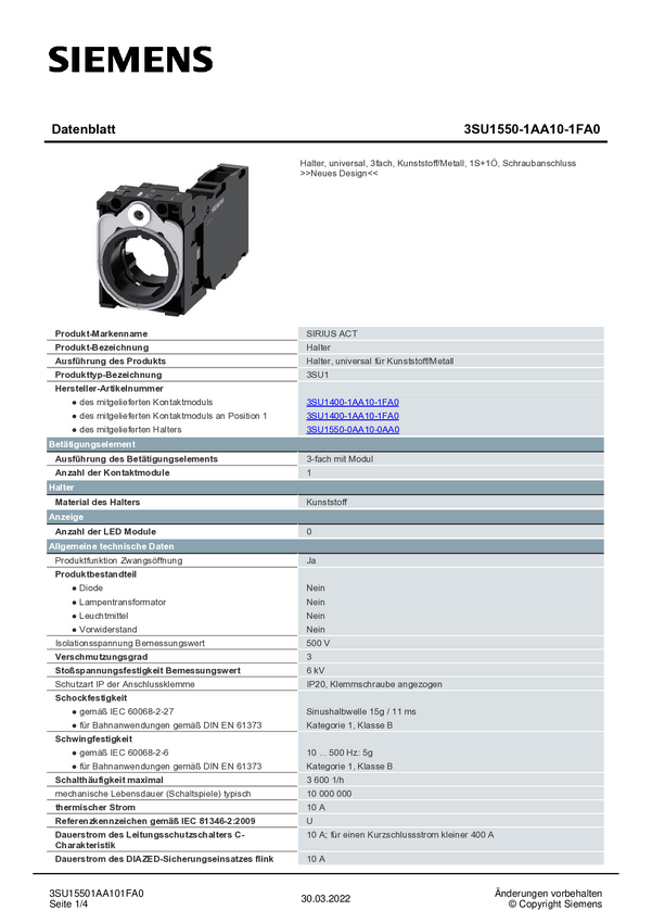 Uchwyt Siemens 3SU1550-1AA10-1FA0 (S x W) 30 mm x 40 mm 1 szt.