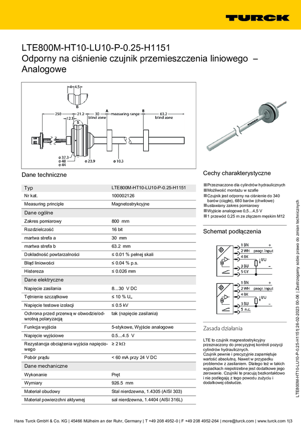 100002126 Turck Czujnik położenia liniowego LTE800M-HT10-LU10-P-0.25-H1151