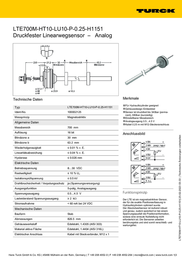 Turck Czujnik położenia liniowego LTE700M-HT10-LU10-P-0.25-H1151