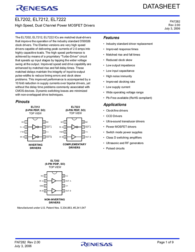 EL7202CN High Speed, Dual Channel Power MOSFET Drivers