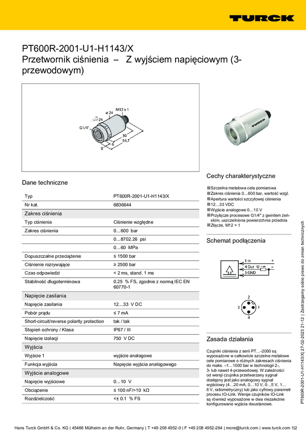 Turck Przetworniki ciśnienia 1 szt. PT600R-2001-U1-H1143/X