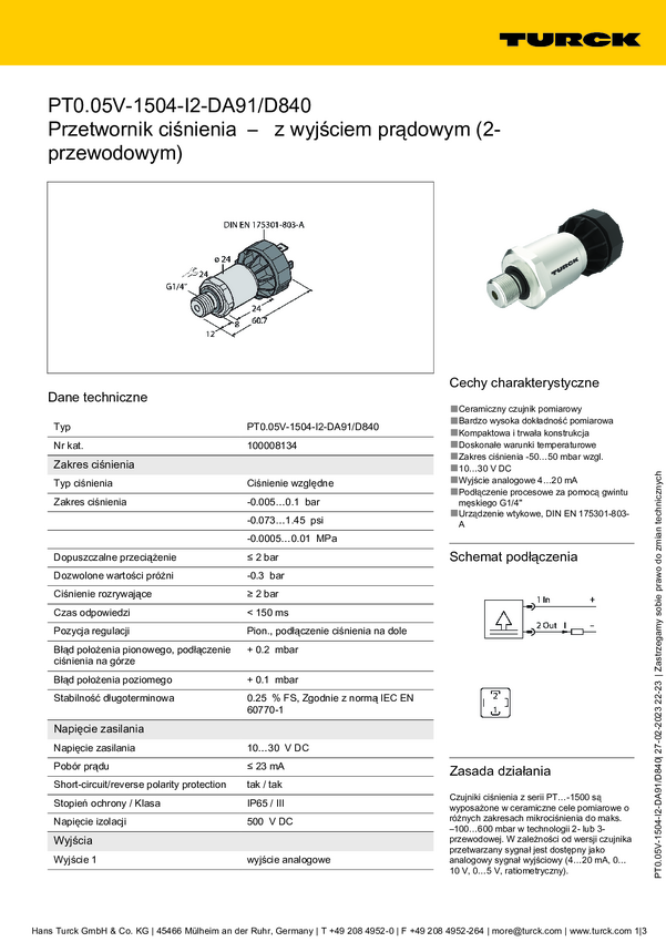 100008134 Turck Przetworniki ciśnienia 1 szt. PT0.05V-1504-I2-DA91/D840