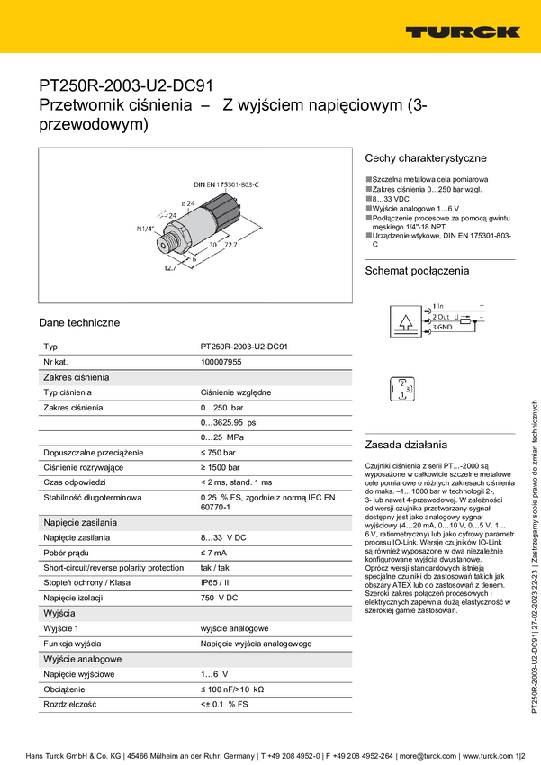 100007955 Turck Przetworniki ciśnienia 1 szt. PT250R-2003-U2-DC91