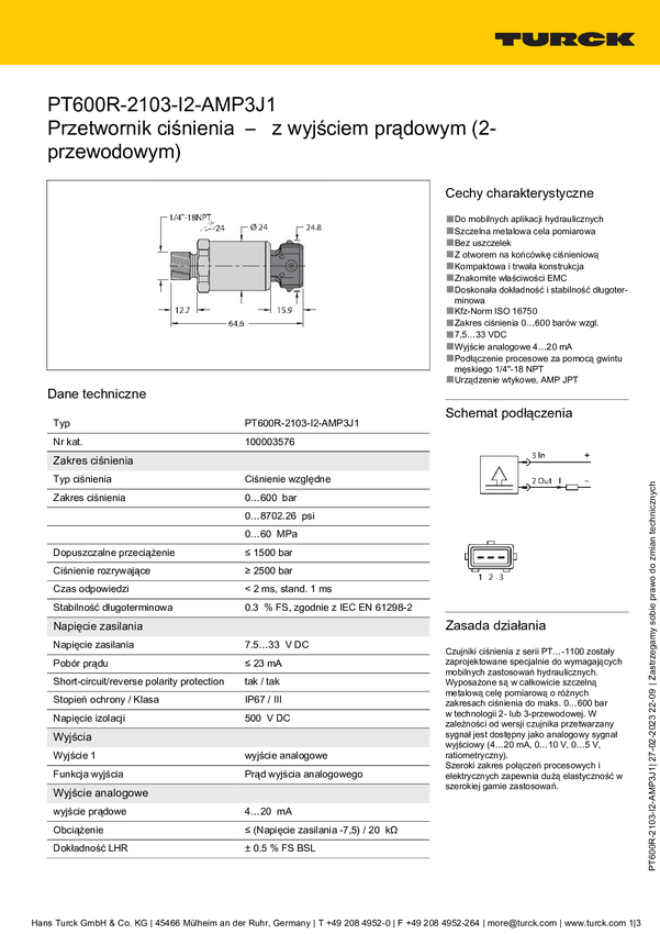 100003576 Turck Przetworniki ciśnienia 1 szt. PT600R-2103-I2-AMP3J1