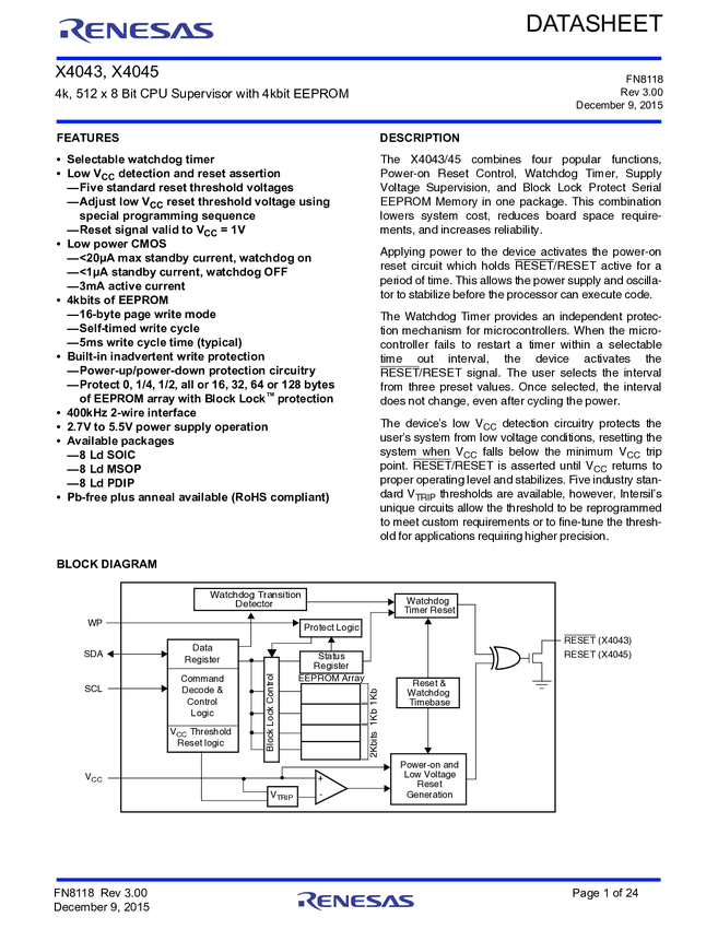 X4043M8IZ-2.7AT1 CPU Supervisor with 4kbit EEPROM