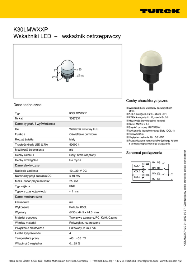 3087334 Lampa okrągła Turck K30LMWXXP 3087334 1 szt.