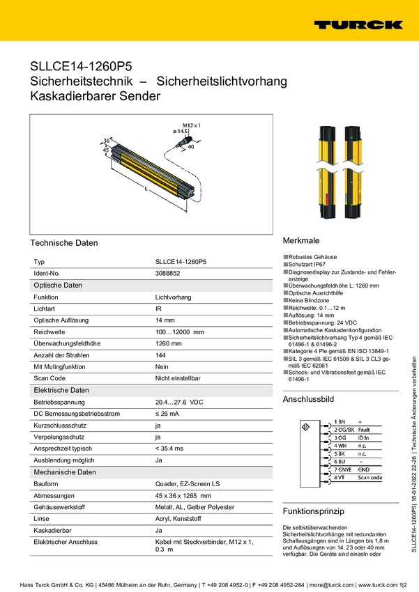 3088852 Turck Kurtyna bezpieczeństwa SLLCE14-1260P5 Wysokość ochronna 1260 mm
