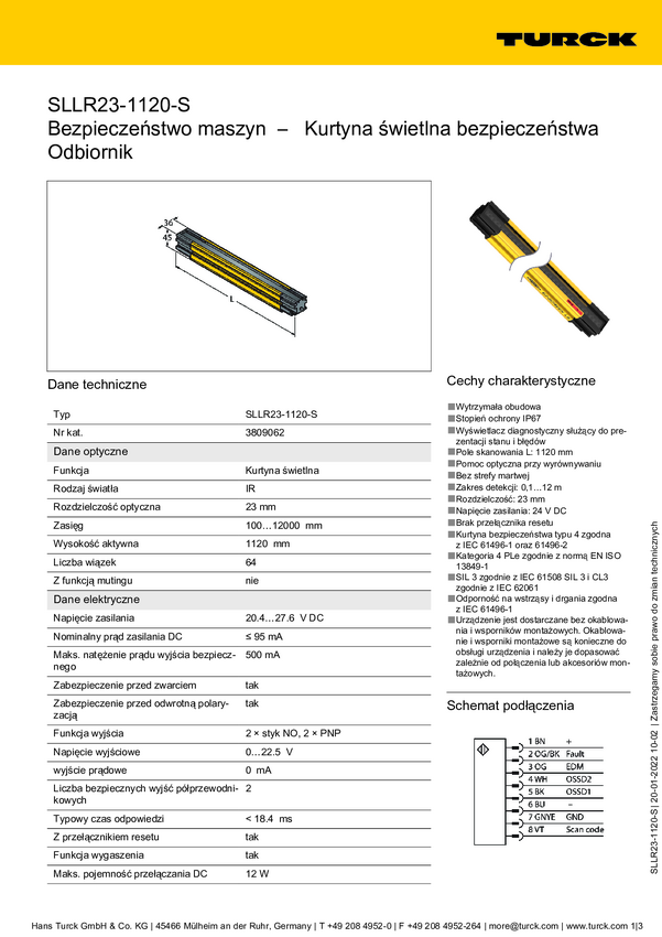 3809062 Turck Kurtyna bezpieczeństwa SLLR23-1120-S Wysokość ochronna 1120 mm