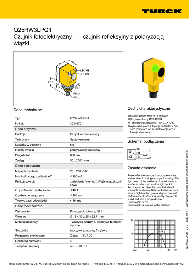 3031970 Fotokomórka odbiciowa Turck Q25RW3LPQ1 3031970 przełączanie w ciemności 1 s...