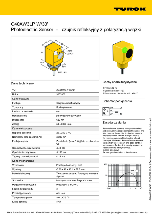 3033900 Fotokomórka odbiciowa Turck Q40AW3LP W/30' 3033900 przełączanie świ...