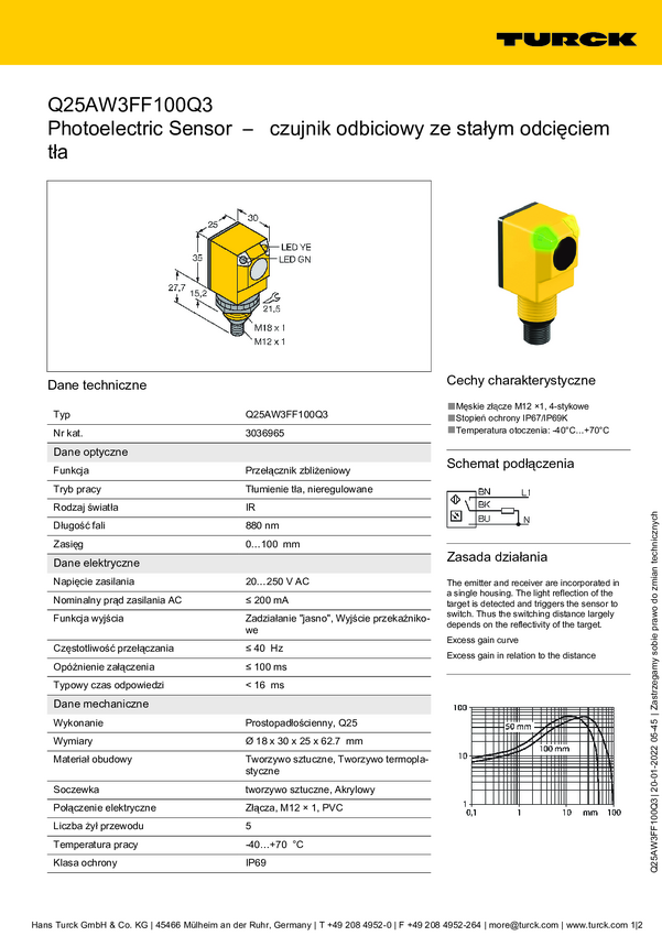 3036965 Czujnik dyfuzyjny Turck Q25AW3FF100Q3 3036965 przełączanie światła 1 szt.