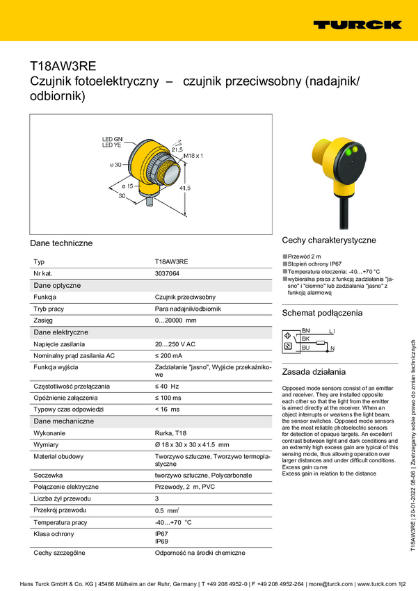 3037064 Bezzwrotny czujnik fotoelektryczny Turck T18AW3RE 3037064 przełączanie świa...