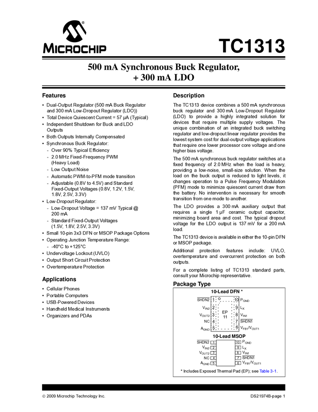 TC1313 500 mA Synchronous Buck Regulator, +300 mA LDO