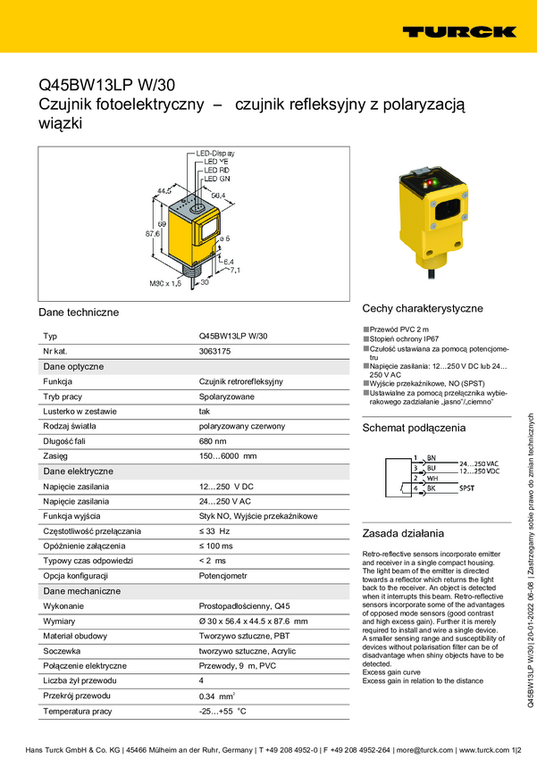 3063175 Fotokomórka odbiciowa Turck Q45BW13LP W/30 3063175 1 szt.