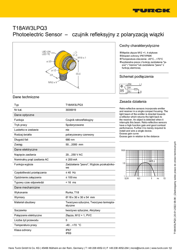 3036919 Fotokomórka odbiciowa Turck T18AW3LPQ3 3036919 przełączanie światła 1 szt.
