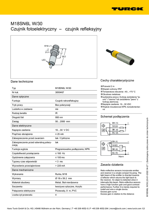 3050467 Fotokomórka odbiciowa Turck M18SN6L W/30 3050467 1 szt.