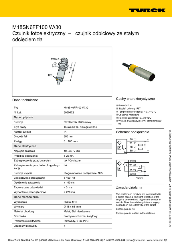 3050472 Czujnik dyfuzyjny Turck M18SN6FF100 W/30 3050472 1 szt.