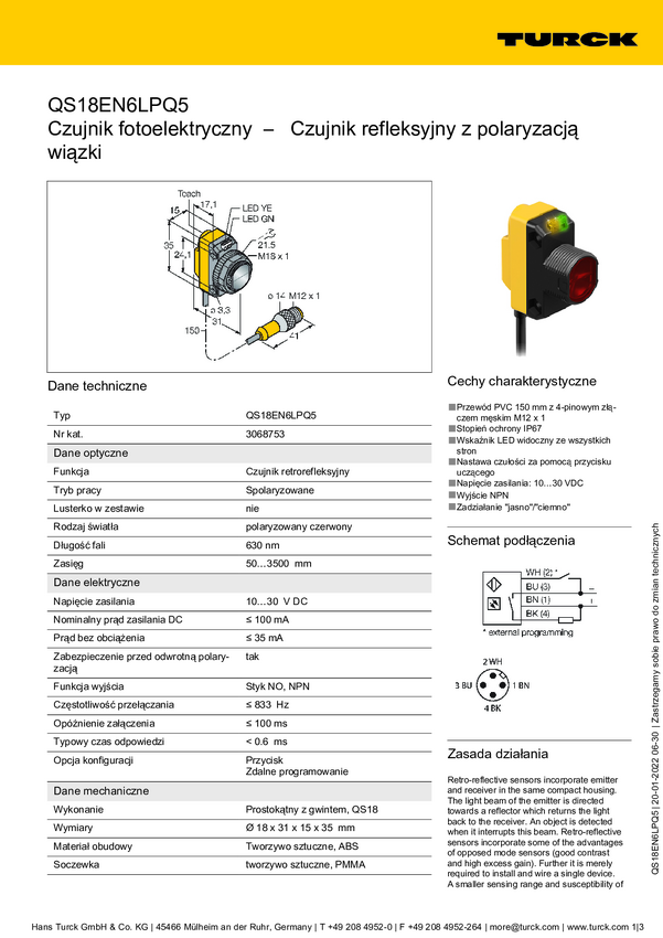 3068753 Fotokomórka odbiciowa Turck QS18EN6LPQ5 3068753 1 szt.