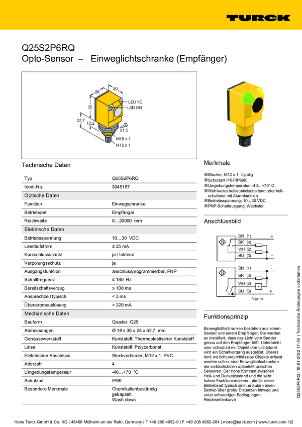 3045157 Bezzwrotny czujnik fotoelektryczny Turck Q25S2P6RQ 3045157 1 szt.
