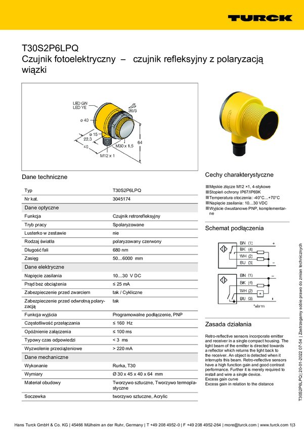 3045174 Fotokomórka odbiciowa Turck T30S2P6LPQ 3045174 1 szt.