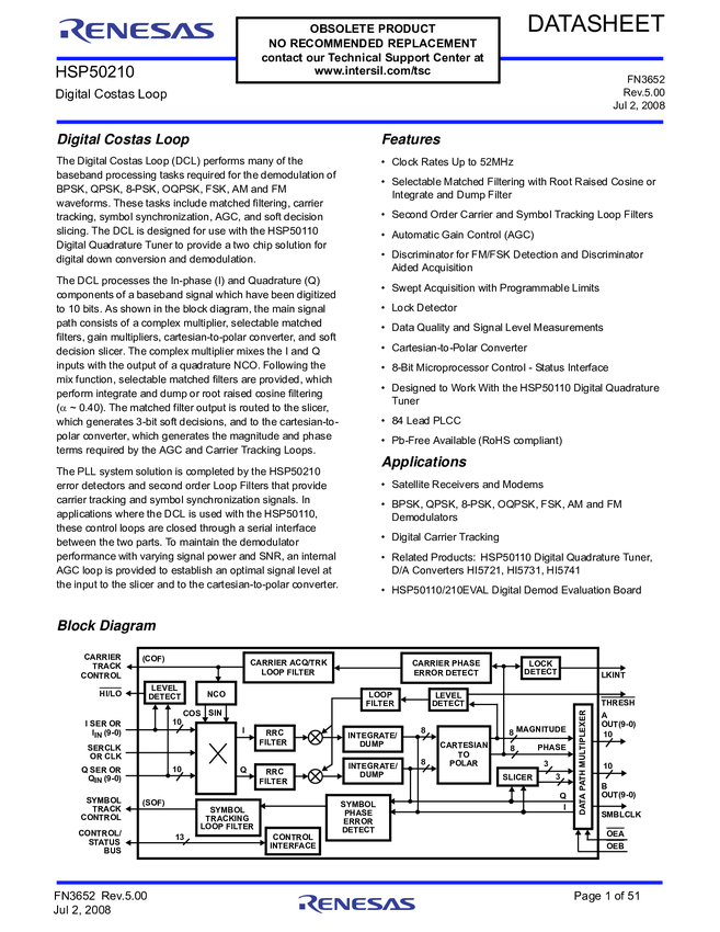 HSP50210JC-52Z Digital Costas Loop