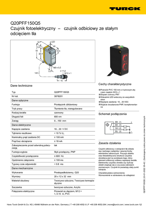 3078201 Czujnik dyfuzyjny Turck Q20PFF150Q5 3078201 1 szt.