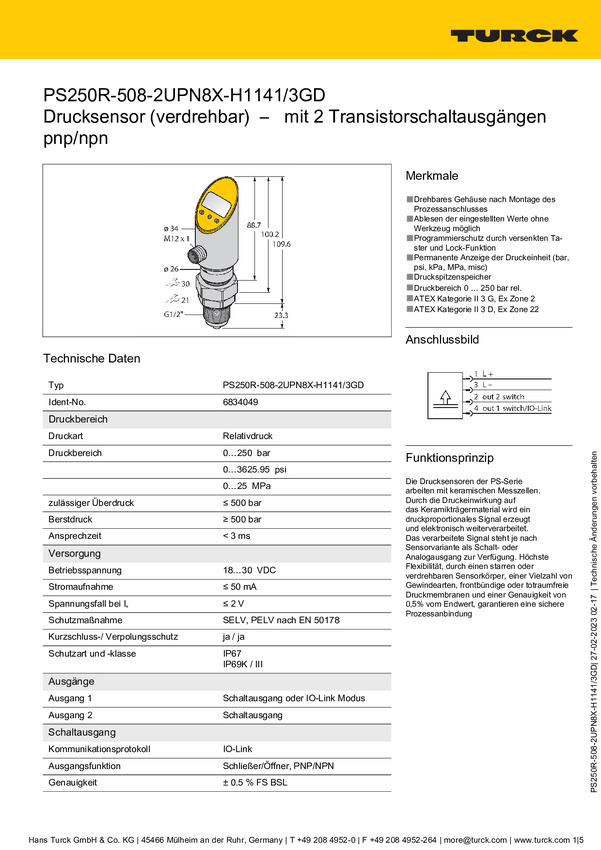 6834049 Turck Przełącznik 1 szt. PS250R-508-2UPN8X- H1141/3GD 0 bar do 250 bar