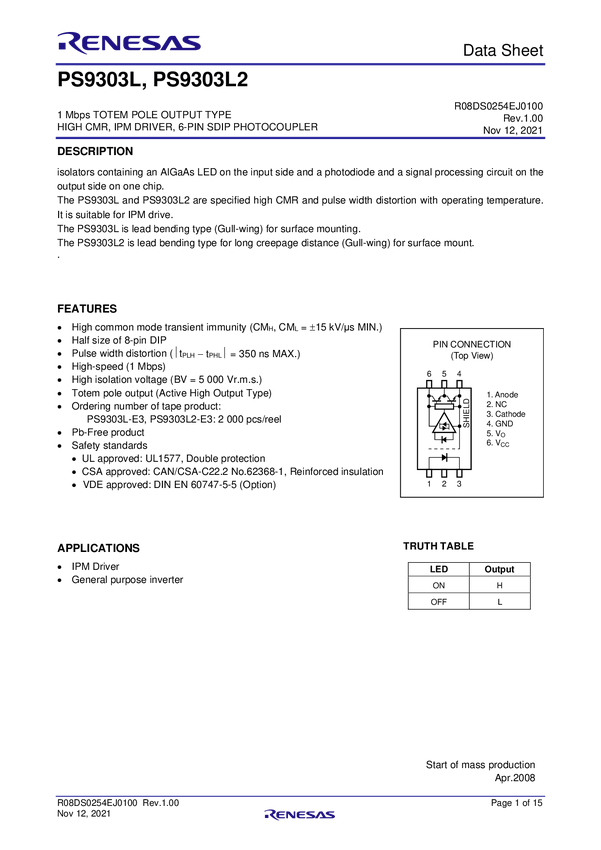PS9303L2-AX 1 Mbps Totem Pole Output Type High CMR, IPM DRIVER 6-PIN SDIP Photocoupler