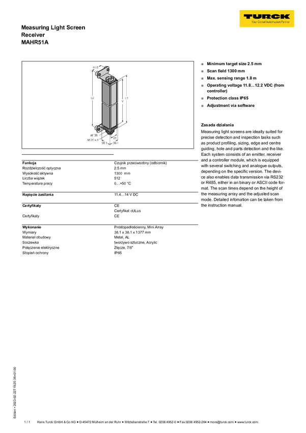 Turck Kurtyna świetlna MAHR51A Wysokość ochronna 1300 mm