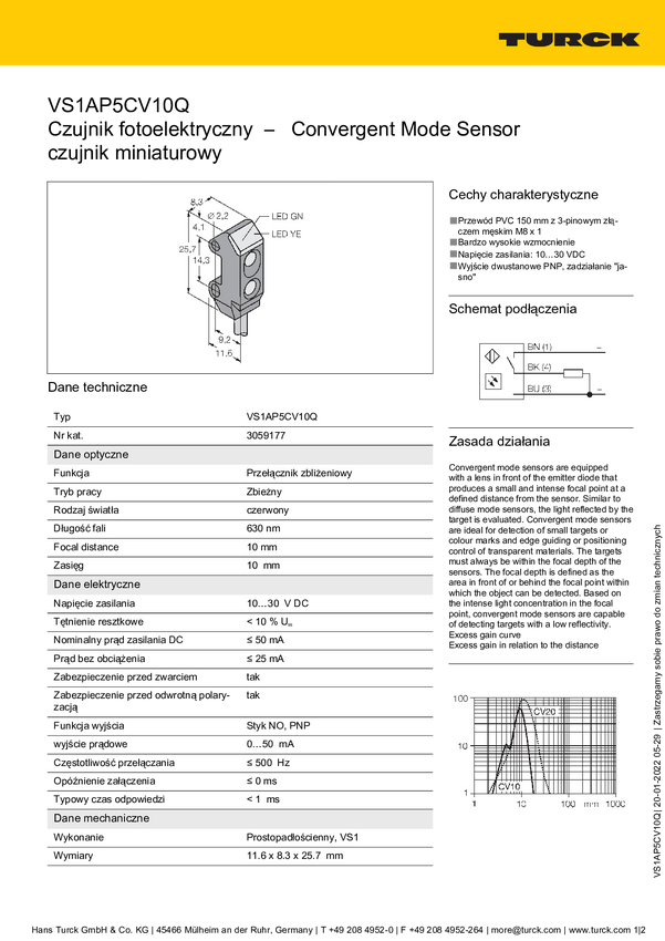 3059177 Czujnik światła Turck VS1AP5CV10Q 3059177 1 szt.