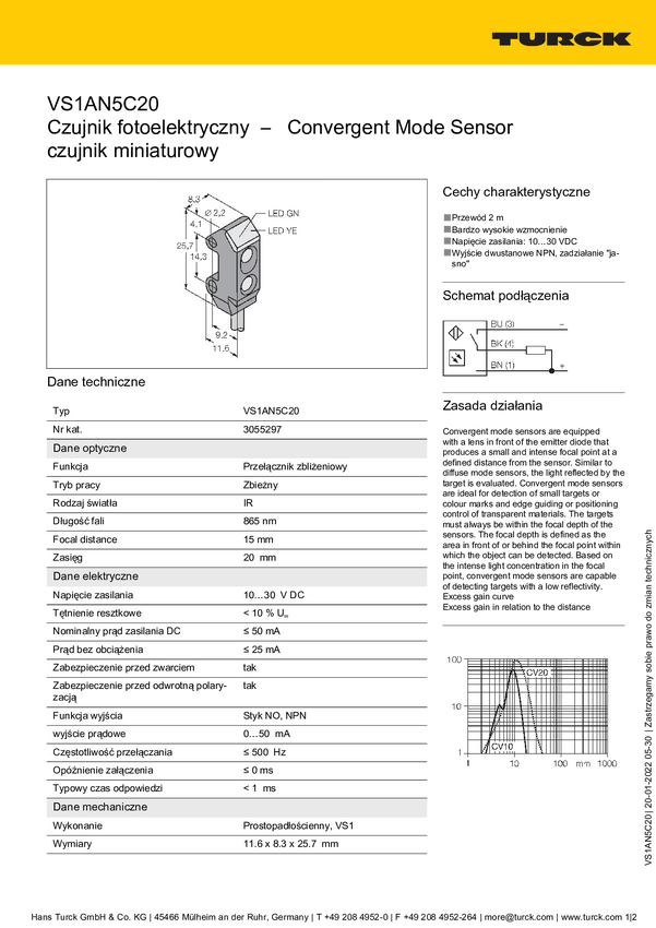 3055297 Czujnik światła Turck VS1AN5C20 3055297 1 szt.
