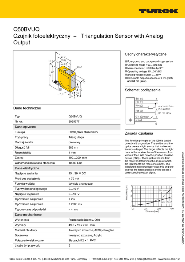 Triangulacyjny czujnik optyczny Turck Q50BVUQ 3065277 1 szt.