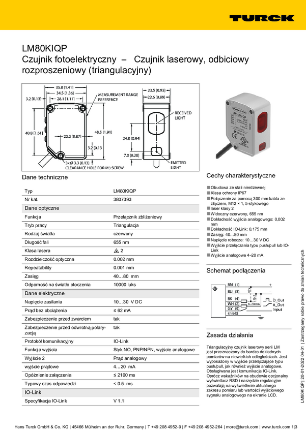 3807393 Turck Czujnik dyfuzyjny PNP, NPN LM80KIQP