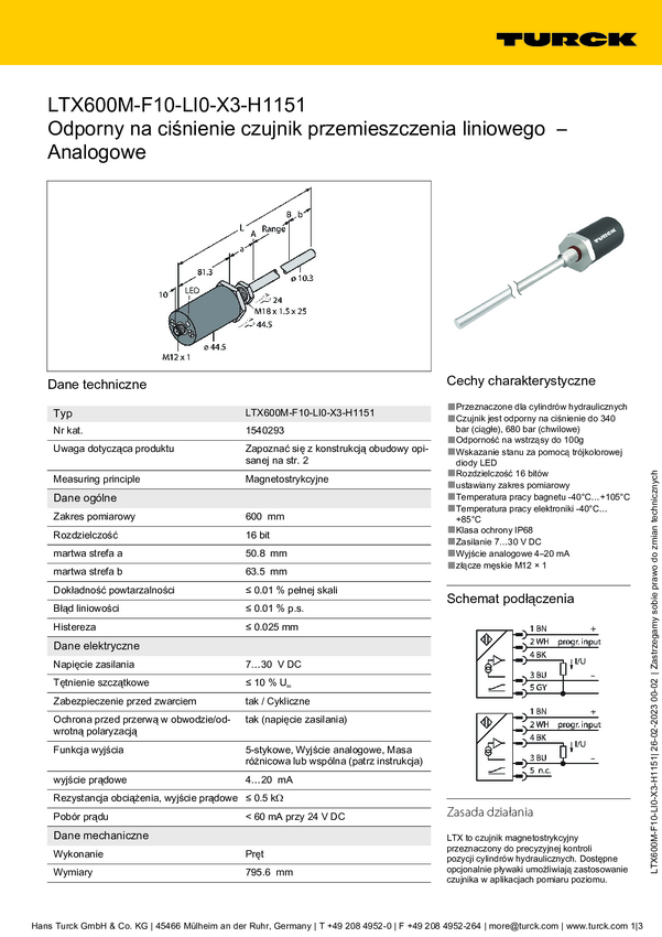 Turck Czujnik położenia liniowego LTX600M-F10-LI0-X3-H1151