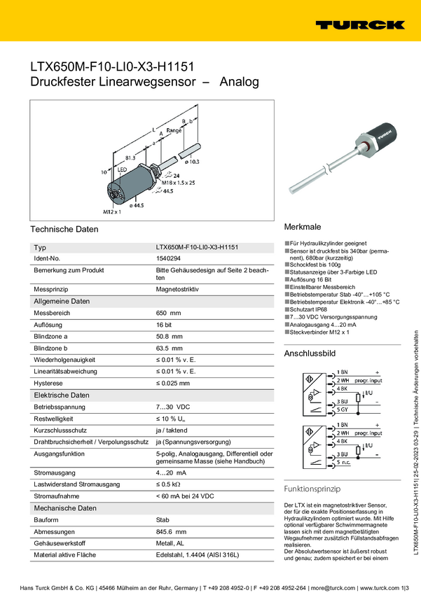 1540294 Turck Czujnik położenia liniowego LTX650M-F10-LI0-X3-H1151