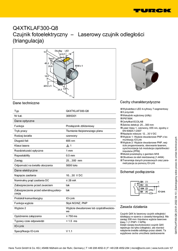 Turck Laserowy czujnik odległości PNP, Zamykający Q4XTKLAF300-Q8
