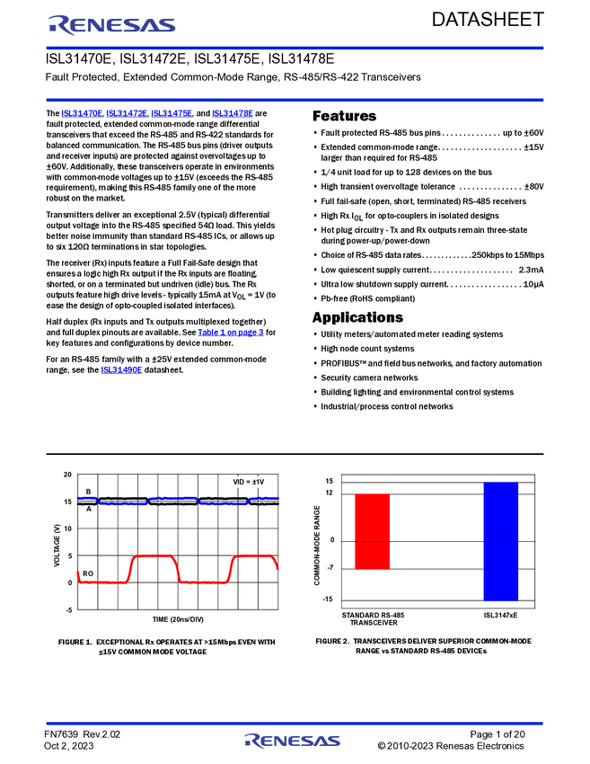 ISL31470EIBZ Fault Protected, Extended Common Mode Range, RS-485/RS-422 Transceivers