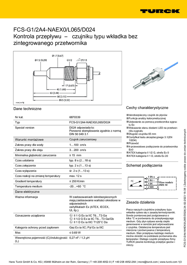 6870339 Turck 6870339 Czujnik zanurzeniowy FCS-G1/2A4-NAEX0/L065/D024,...