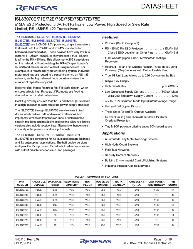 ±15kV ESD Protected, 3.3V, Full Fail-safe, Low Power, High Speed or Slew Rate Limited, RS-485/RS-422 Transceivers