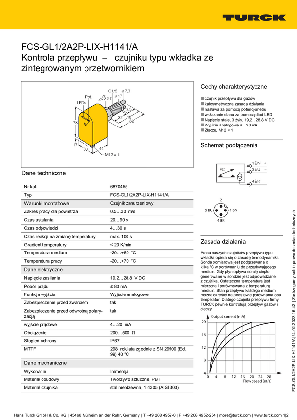 6870455 Turck Czujnik zanurzeniowy FCS-GL1/2A2P-LIX-H1141/A 6870455 Zasilan...