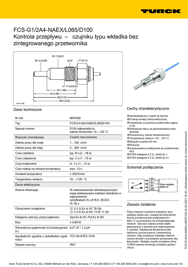 Turck 6870382 Czujnik zanurzeniowy FCS-G1/2A4-NAEX/L065/D100, 1 szt.